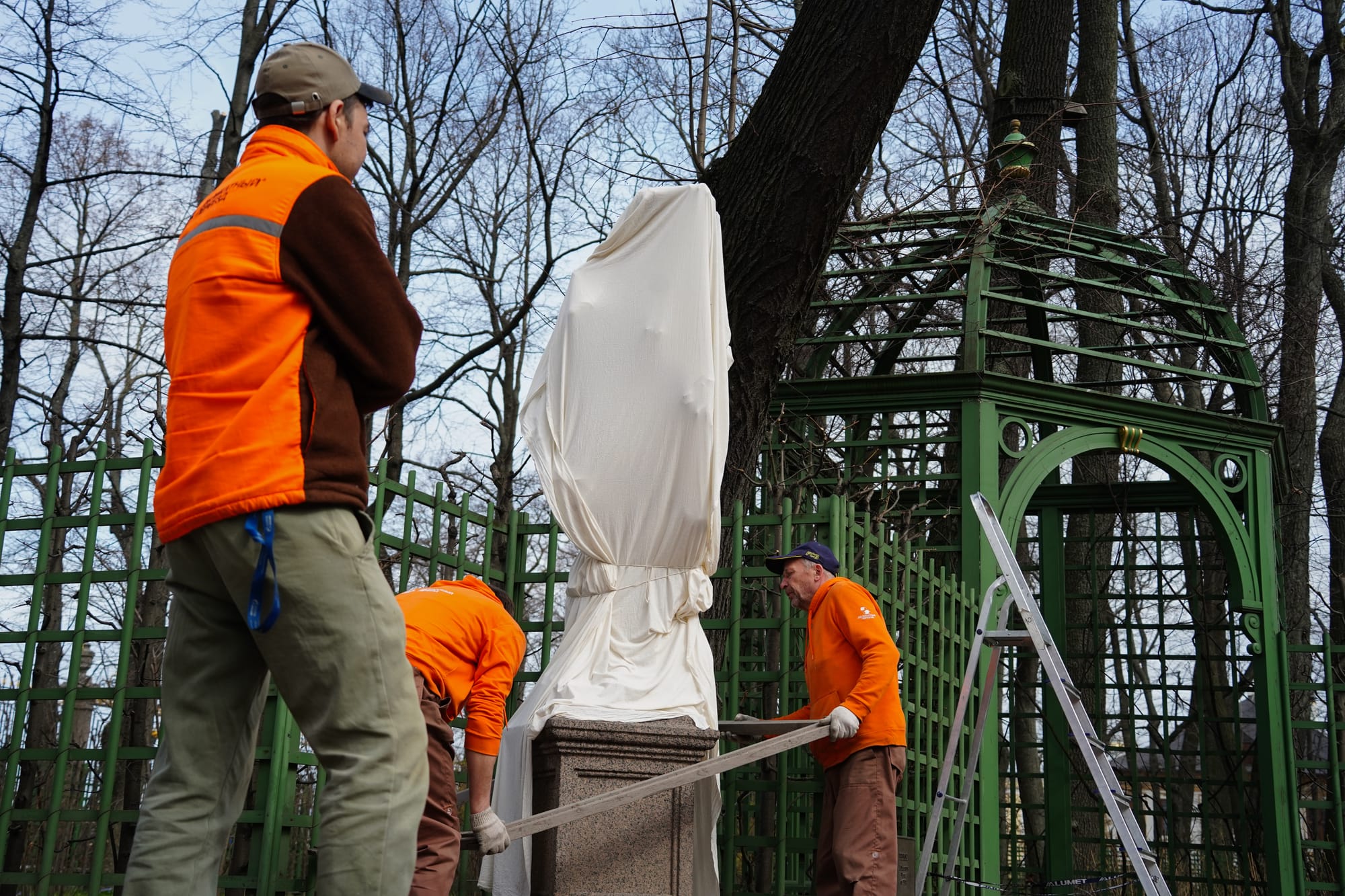 Сегодня в Летнем саду сняли деревянные короба со статуй после зимовки, а также приступили к сносу старых деревьев в целях безопасности — специалисты установили, что их бесполезно лечить, и в данный момент они представляют угрозу для посетителей сада. Вместо них высадят новые.